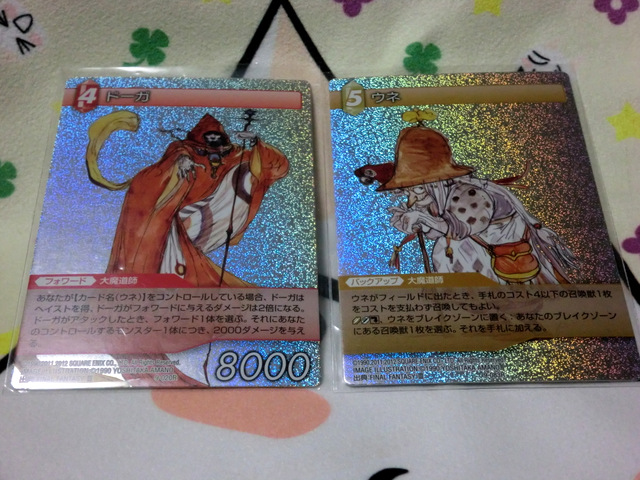 Capter9 FF-TCG プレリリースパーティに行ってきましたFF-TCGの新弾発売の約1週間前に行われるプレリリースパーティ。こちらは発売よりはやくカードが入手できる、このイベントでしか配布されないPRカードが、参加賞として必ず入手できるという事で毎回参加をしていますが、今回は3か所まわって1か所しか参加できない!くらい参加者が殺到…初のプレリ難民を体験しました…(都内)というのも、開催場所が前回より減ってしまっている、定員も減っている場所がある、PRカードがSRのクラウドであるといったことが原因かと…でも何とかPRクラウドを入手で来ただけでもありがたいことです…しかもトレジャーアタリ券も持ち帰れたので充分かなと…(クリックでTwitpic画像を表示)その他に持ち帰れたカードはこちら↓自力↓他力含む↓他力w(それぞれクリックでTwitpic画像を表示)天野さんの絵柄ではドーガとウネ(FF3)がプレミアム版で出たのがうれしかったかも。(クリックで拡大)ちなみにこちらのカードショップさんのブログで、9弾の全カードリスト(162種)が公開されています。グランドパンダキャニオンのプレイヤーブログ♪プレリ難民になったわけですが、某ショップでキャラバンのポスターを発見!こちらFF7ACのセフィロスです。ホビージャパンさん、こんなポスター作るなんて…欲しいですw(クリックでTwitpic画像を表示)で、ここからは個人メモ。今回のプレリの開封状況を観察して1カートン(12BOX/1920枚)で買った時の1絵柄あたりの封入割合を計算してみました。ちなみに今回のレア度割合はこちら。1パックには「UCが2、SRまたはRが1、Cが5」の8枚が入っています。そこでノーマル版のC-コモン- 1絵柄:16~17枚/ (5×20-7)×12÷66UC-アンコモン-1絵柄:10枚/ 2×20×12÷48R-レア-:1絵柄:6枚/ 17×12÷34SR-スペシャルレア-1絵柄:2~3枚/ 3×12÷14といった封入率ではないでしょうか。ちなみに1BOX中に7枚はプレミアム版(キラキラカード)があるようです。※これまでの封入率で、9弾もそのように見えました。なので、1カートン(1920枚)買うと、プレミアム版は7×12=84枚がランダムで入手できる計算。で、プレリでは2BOX(14枚)に1枚はSRのプレミアムが出ていたように見えたので、14種のSRプレミアムを入手するには……恐ろしい計算になってしまった。これは「たまたま」かもしれないので、もっと出る事を願いますwさて、この計算合っているでしょうか、答えは3月15日…開封結果つぶやきますw(←今回も予約しちゃいました) http:// [1回]PR 2013年 03月 11日| FF-TCG|comment(-)